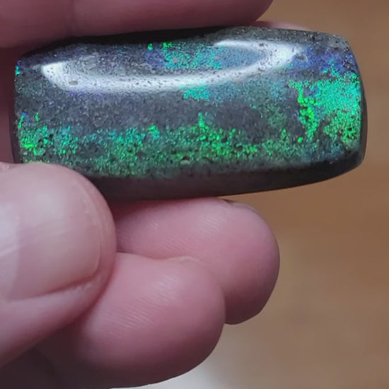 Discover the captivating beauty of this ethically sourced Andamooka Matrix Opal cabochon, expertly cut and treated in the heart of Arkansas. Sourced directly from miners in Australia, this stunning hexagonal gem showcases vibrant flashes of blue and green play-of-color embedded within a striking black/gray matrix, making it a standout piece for jewelry designers, collectors, and opal enthusiasts alike.