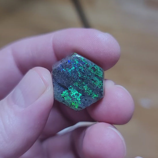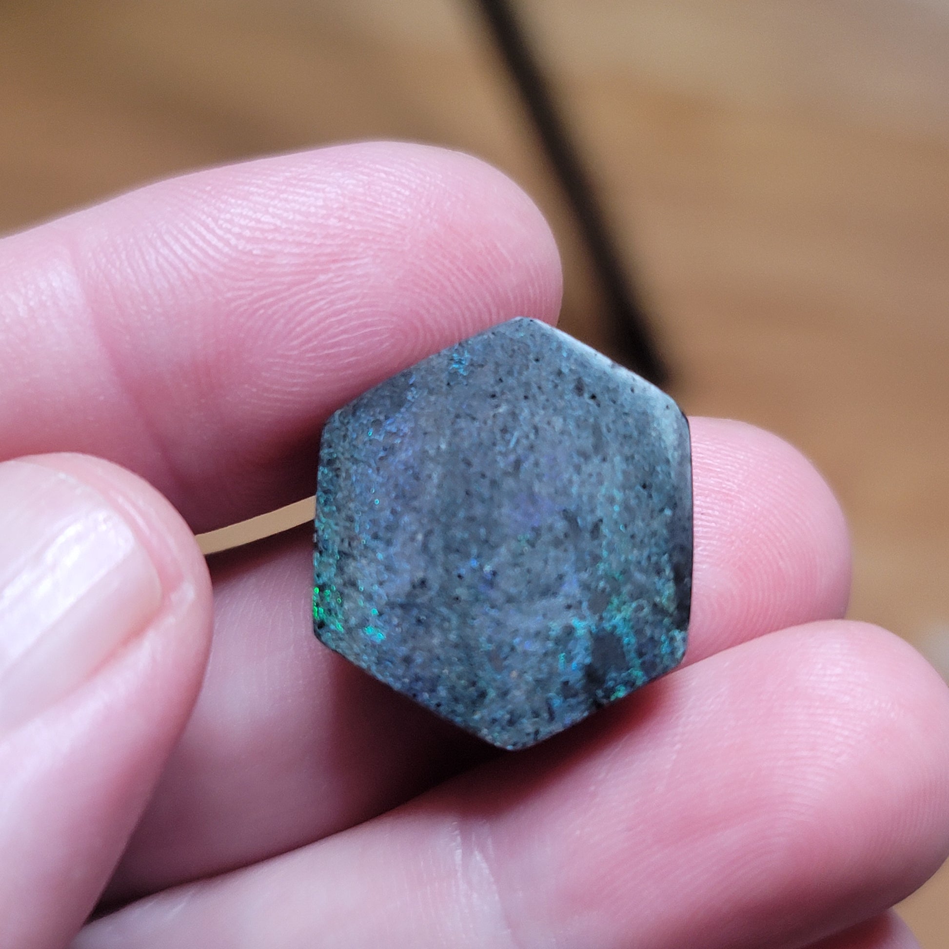 Discover the captivating beauty of this ethically sourced Andamooka Matrix Opal cabochon, expertly cut and treated in the heart of Arkansas. Sourced directly from miners in Australia, this stunning hexagonal gem showcases vibrant flashes of blue and green play-of-color embedded within a striking black/gray matrix, making it a standout piece for jewelry designers, collectors, and opal enthusiasts alike.