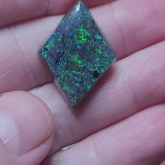 Discover the captivating beauty of this ethically sourced Andamooka Matrix Opal cabochon, expertly cut and treated in the heart of Arkansas. Sourced directly from miners in Australia, this stunning hexagonal gem showcases vibrant flashes of blue and green play-of-color embedded within a striking black/gray matrix, making it a standout piece for jewelry designers, collectors, and opal enthusiasts alike.