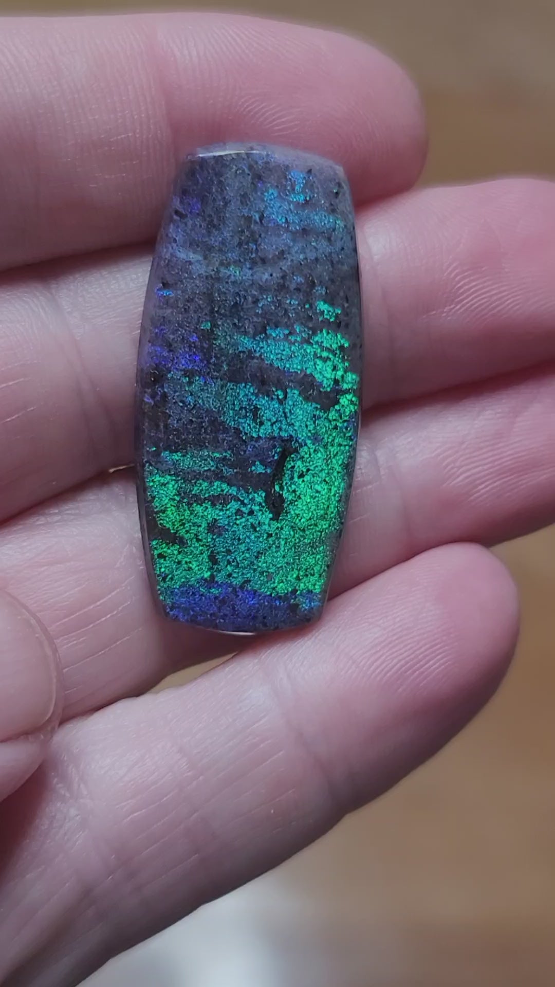 Discover the captivating beauty of this ethically sourced Andamooka Matrix Opal cabochon, expertly cut and treated in the heart of Arkansas. Sourced directly from miners in Australia, this stunning hexagonal gem showcases vibrant flashes of blue and green play-of-color embedded within a striking black/gray matrix, making it a standout piece for jewelry designers, collectors, and opal enthusiasts alike.