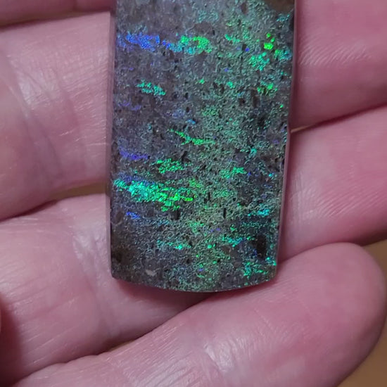 Discover the captivating beauty of this ethically sourced Andamooka Matrix Opal cabochon, expertly cut and treated in the heart of Arkansas. Sourced directly from miners in Australia, this stunning hexagonal gem showcases vibrant flashes of blue and green play-of-color embedded within a striking black/gray matrix, making it a standout piece for jewelry designers, collectors, and opal enthusiasts alike.