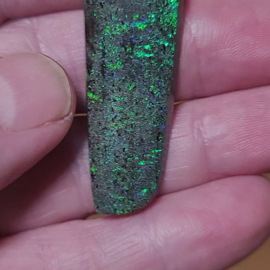 Discover the captivating beauty of this ethically sourced Andamooka Matrix Opal cabochon, expertly cut and treated in the heart of Arkansas. Sourced directly from miners in Australia, this stunning hexagonal gem showcases vibrant flashes of blue and green play-of-color embedded within a striking black/gray matrix, making it a standout piece for jewelry designers, collectors, and opal enthusiasts alike.