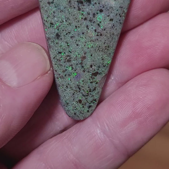 Discover the captivating beauty of this ethically sourced Andamooka Matrix Opal cabochon, expertly cut and treated in the heart of Arkansas. Sourced directly from miners in Australia, this stunning hexagonal gem showcases vibrant flashes of blue and green play-of-color embedded within a striking black/gray matrix, making it a standout piece for jewelry designers, collectors, and opal enthusiasts alike.