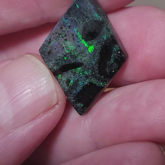 Discover the captivating beauty of this ethically sourced Andamooka Matrix Opal cabochon, expertly cut and treated in the heart of Arkansas. Sourced directly from miners in Australia, this stunning hexagonal gem showcases vibrant flashes of blue and green play-of-color embedded within a striking black/gray matrix, making it a standout piece for jewelry designers, collectors, and opal enthusiasts alike.