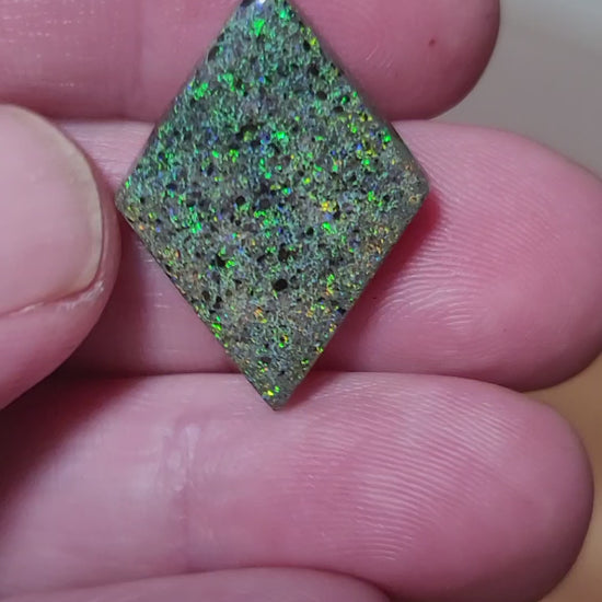 Discover the captivating beauty of this ethically sourced Andamooka Matrix Opal cabochon, expertly cut and treated in the heart of Arkansas. Sourced directly from miners in Australia, this stunning hexagonal gem showcases vibrant flashes of blue and green play-of-color embedded within a striking black/gray matrix, making it a standout piece for jewelry designers, collectors, and opal enthusiasts alike.