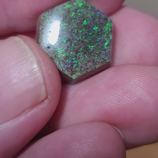 Discover the captivating beauty of this ethically sourced Andamooka Matrix Opal cabochon, expertly cut and treated in the heart of Arkansas. Sourced directly from miners in Australia, this stunning hexagonal gem showcases vibrant flashes of blue and green play-of-color embedded within a striking black/gray matrix, making it a standout piece for jewelry designers, collectors, and opal enthusiasts alike.